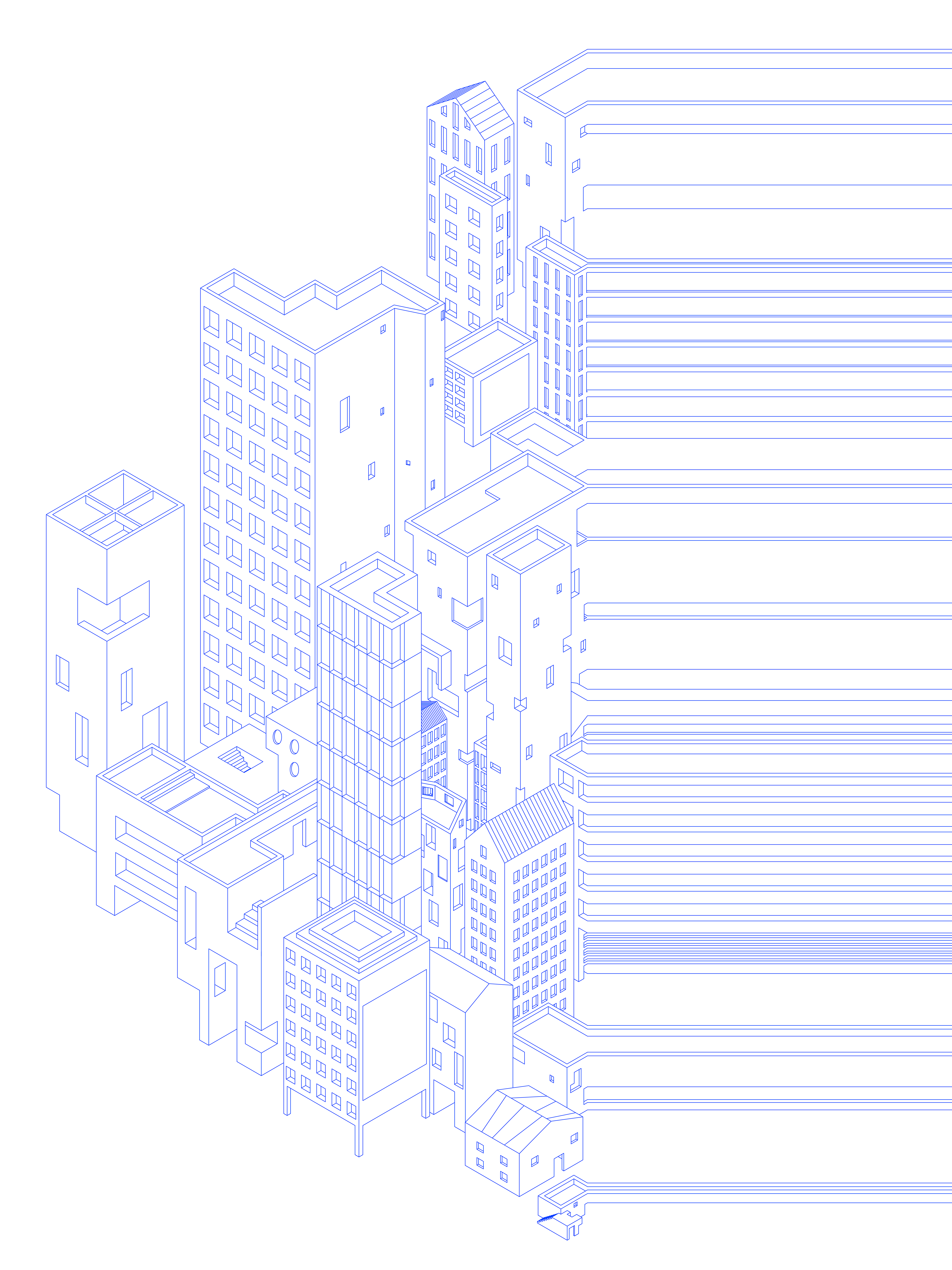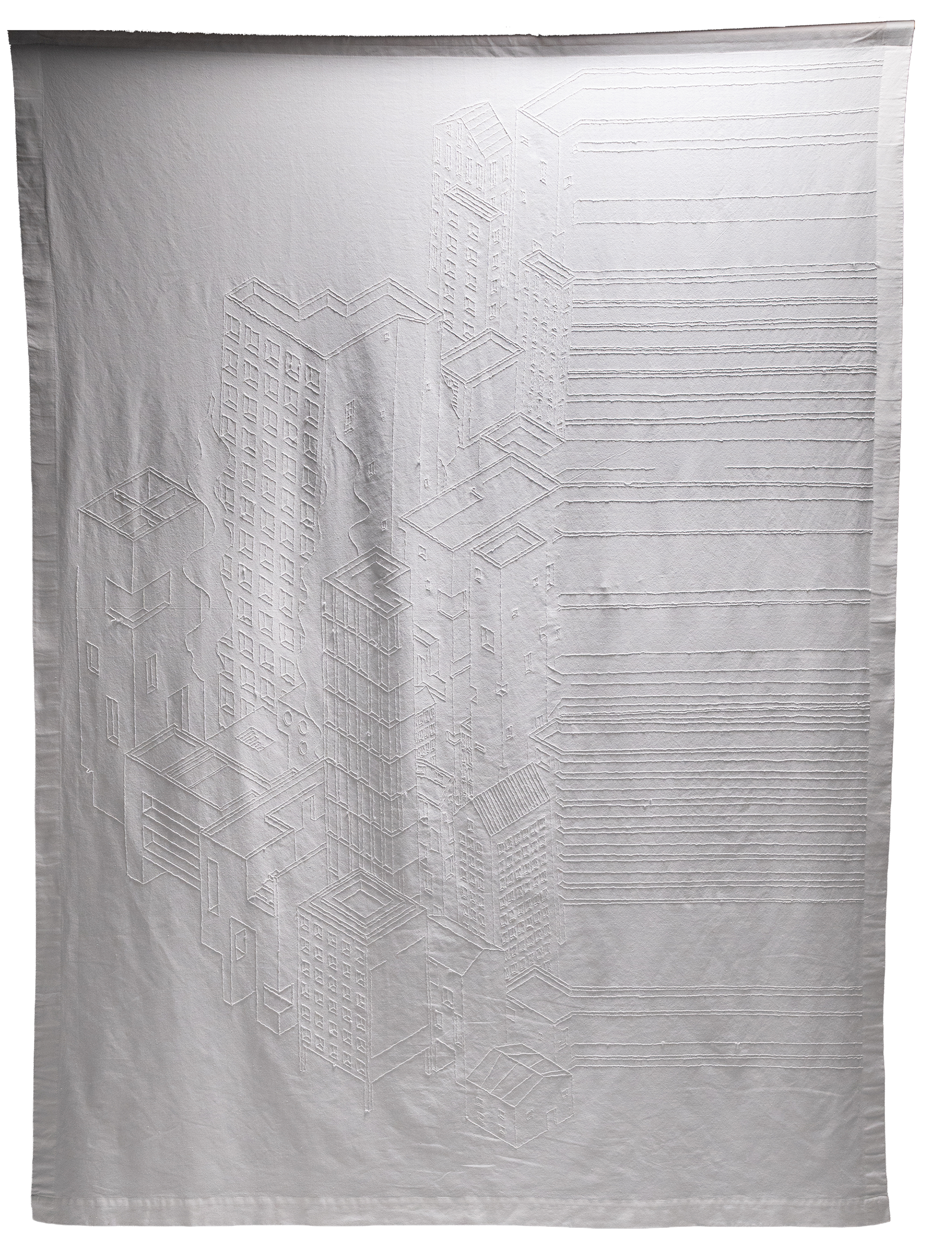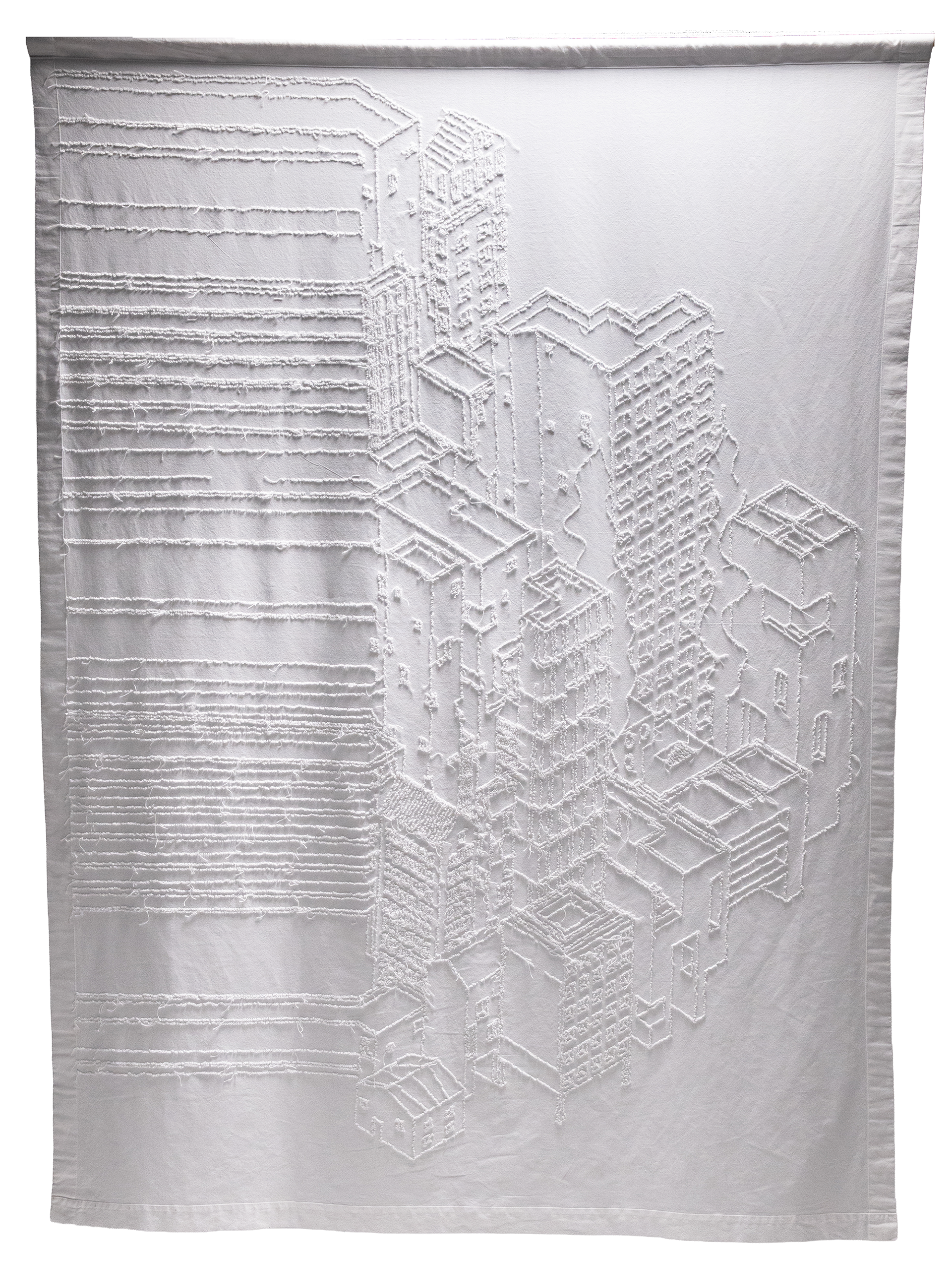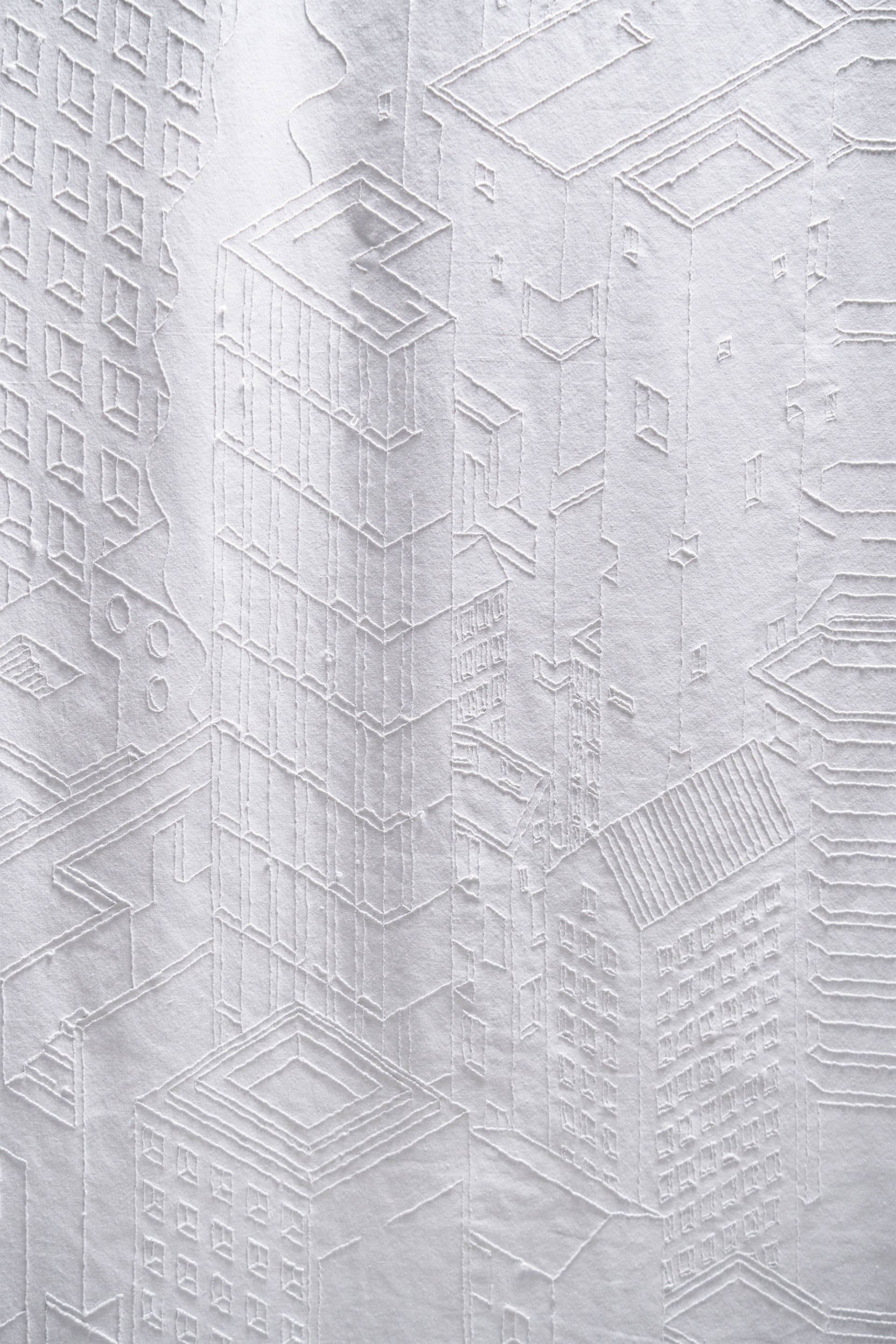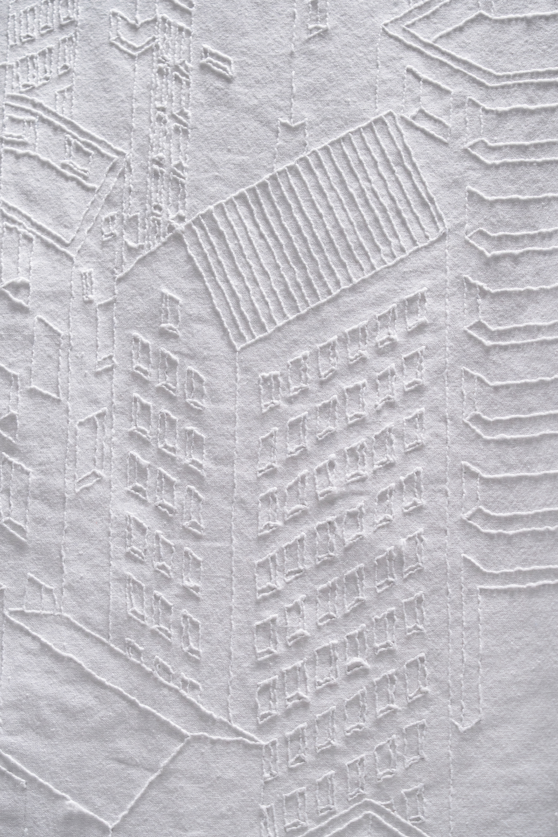 Threshold is a large-scale punch embroidery work that reads the continuous flow of modern urban life through a cross-section severed by the sudden intervention of the COVID-19 pandemic. Rendered in isometric perspective, the composition abruptly bisects, where architectural forms dissolve into abstract horizontal threads.