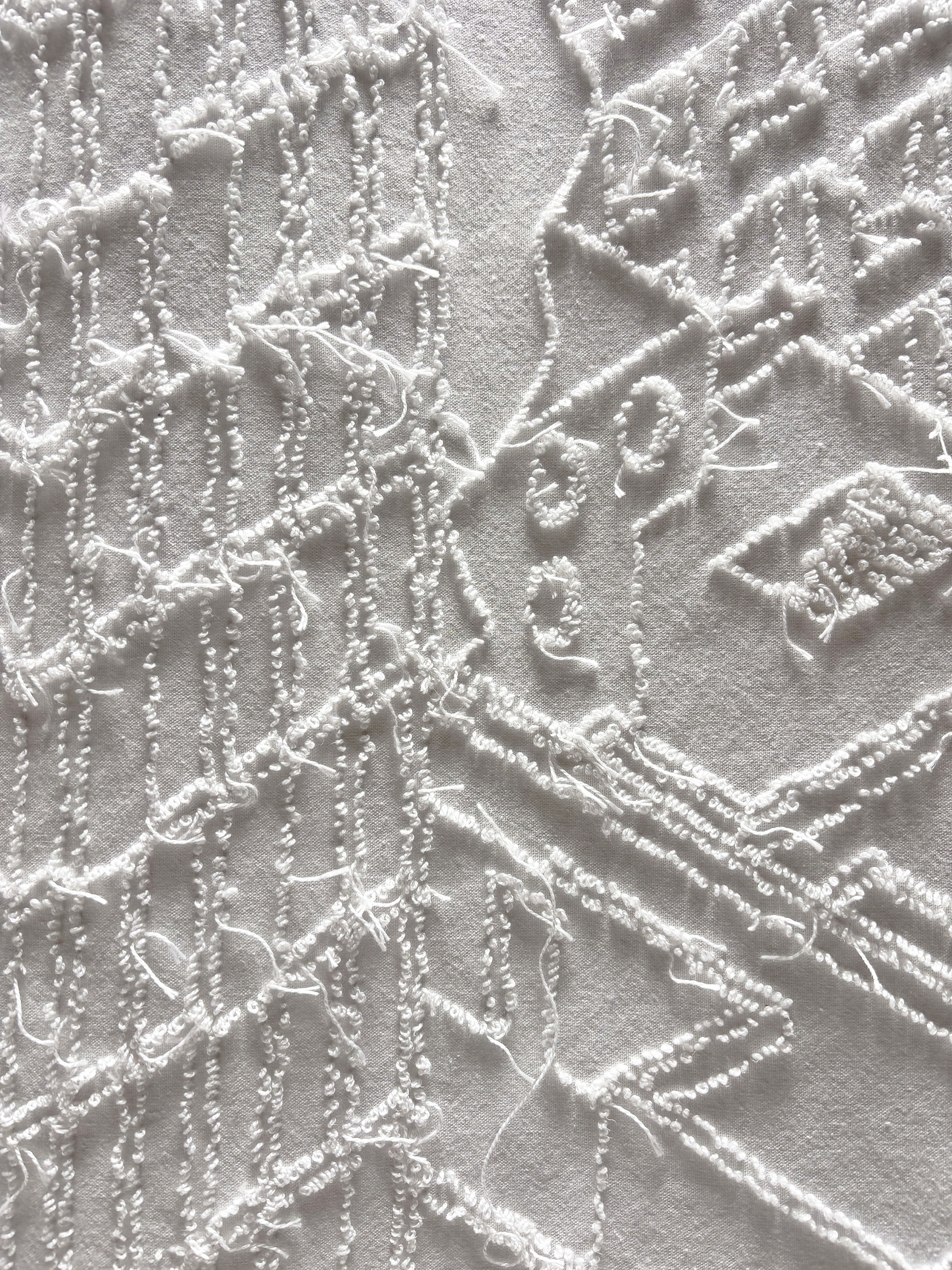 The use of this labor-intensive craft reinforces the concept; the repetitive stitching reproduces the states of deceleration and endurance experienced during the pandemic, where each loop acts as a tactile record of that specific time.