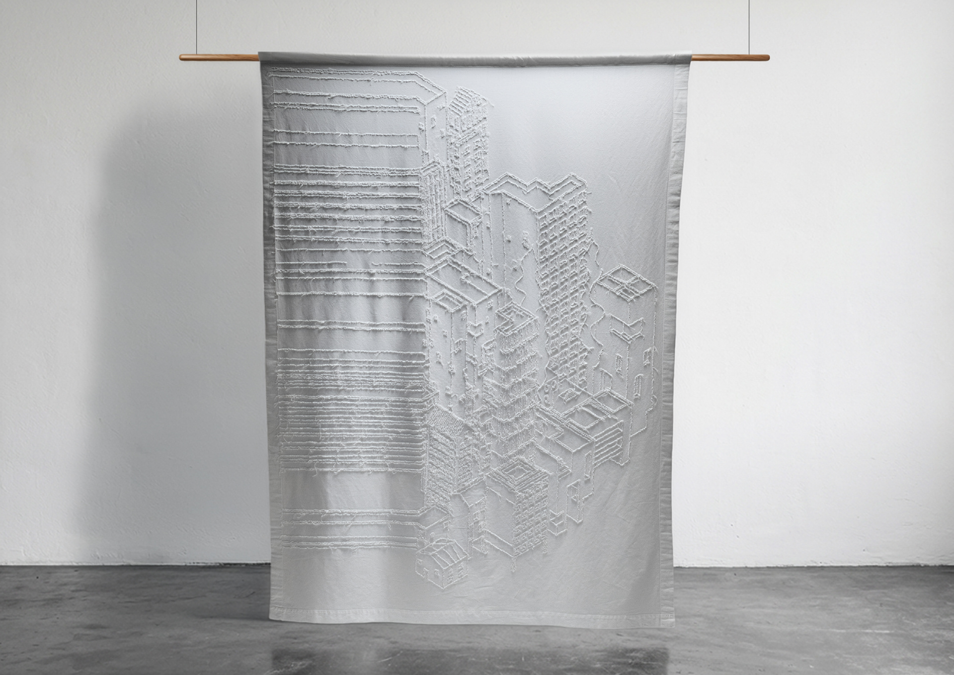 Threshold is a large-scale punch embroidery work that reads the flow of modern urban life through a cross-section severed by the COVID-19 pandemic. Rendered in an isometric perspective, the composition visualizes this abrupt halt; architectural forms suddenly bisect, dissolving into abstract threads, marking a clear moment of rupture.