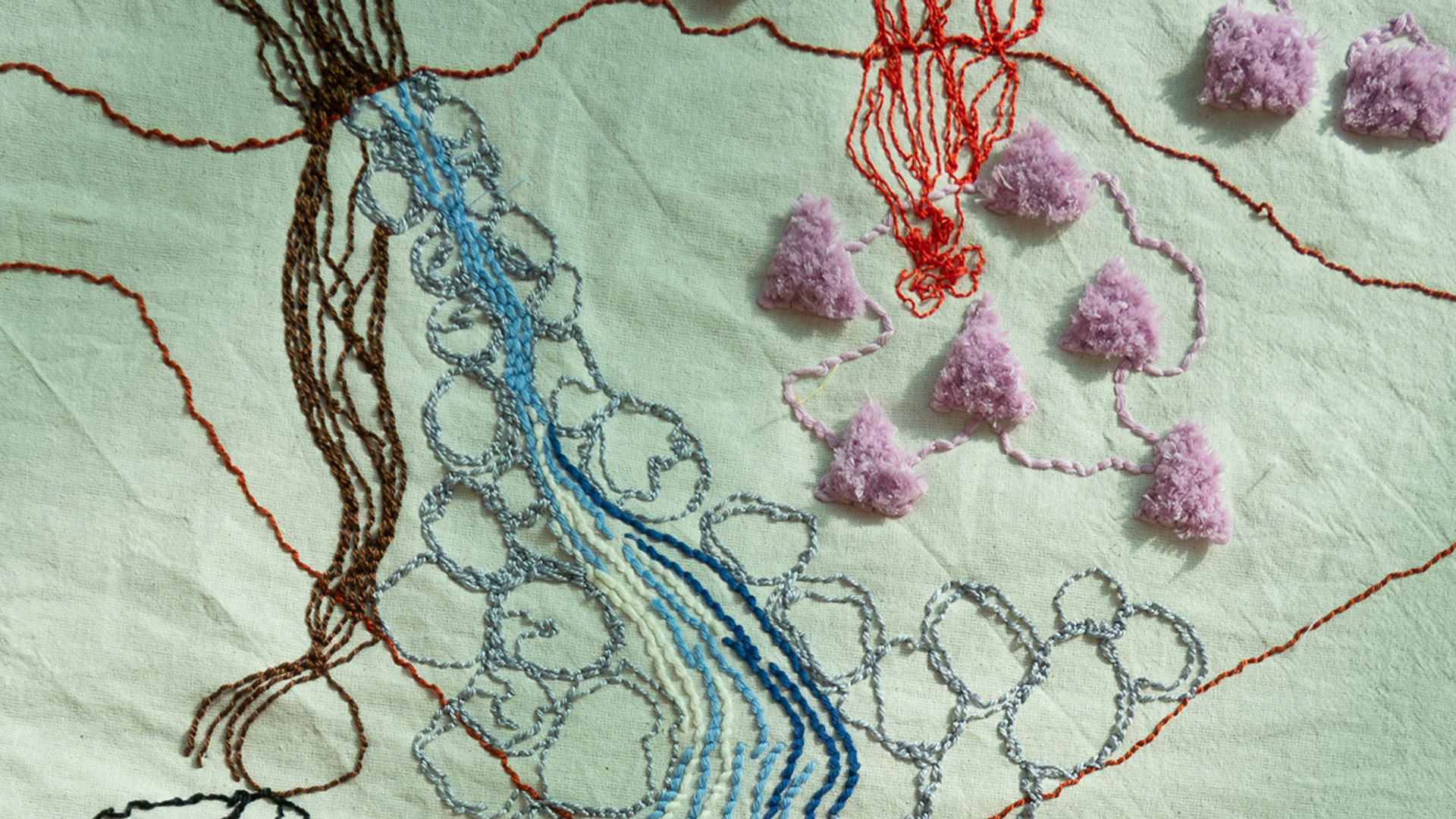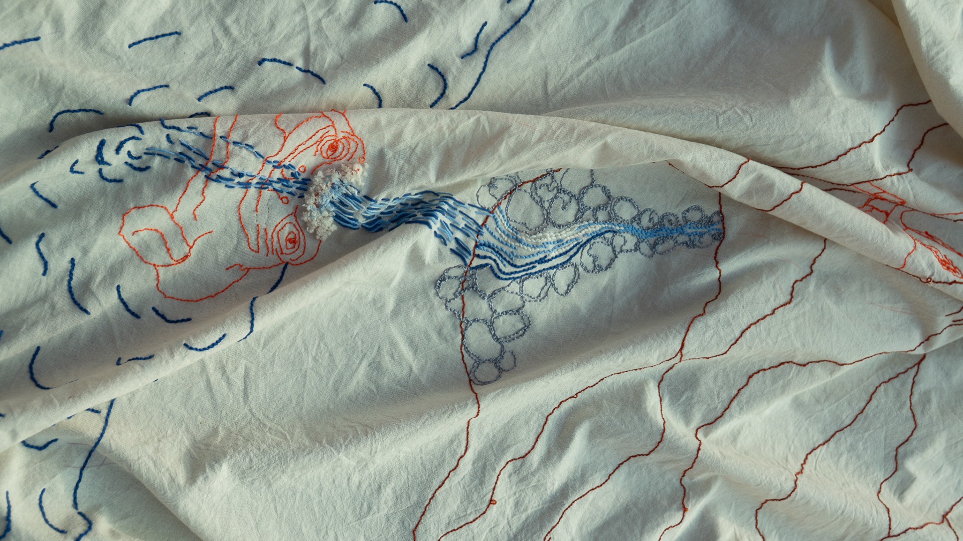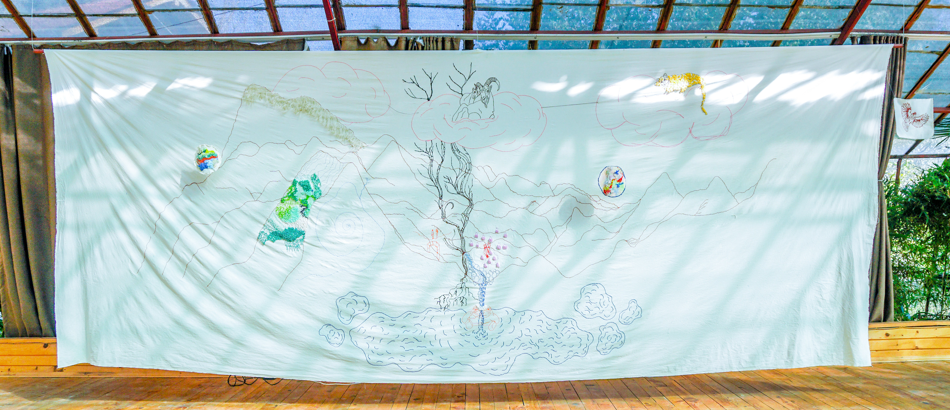 What Is Inside the Mountain? / Dağın İçinde Ne Var?", hand embroidery on unbleached cotton fabric, 600 x 200 cm, edition 1/1, 2026. "The Path is the Soul of a Mountain - Elements That Shape Life Exhibition Series III" Group Exhibition, curated by Melike Bayık, Oksitosin & Greenhouse Art Days, Antalya. Photos: Karanlık Kutu