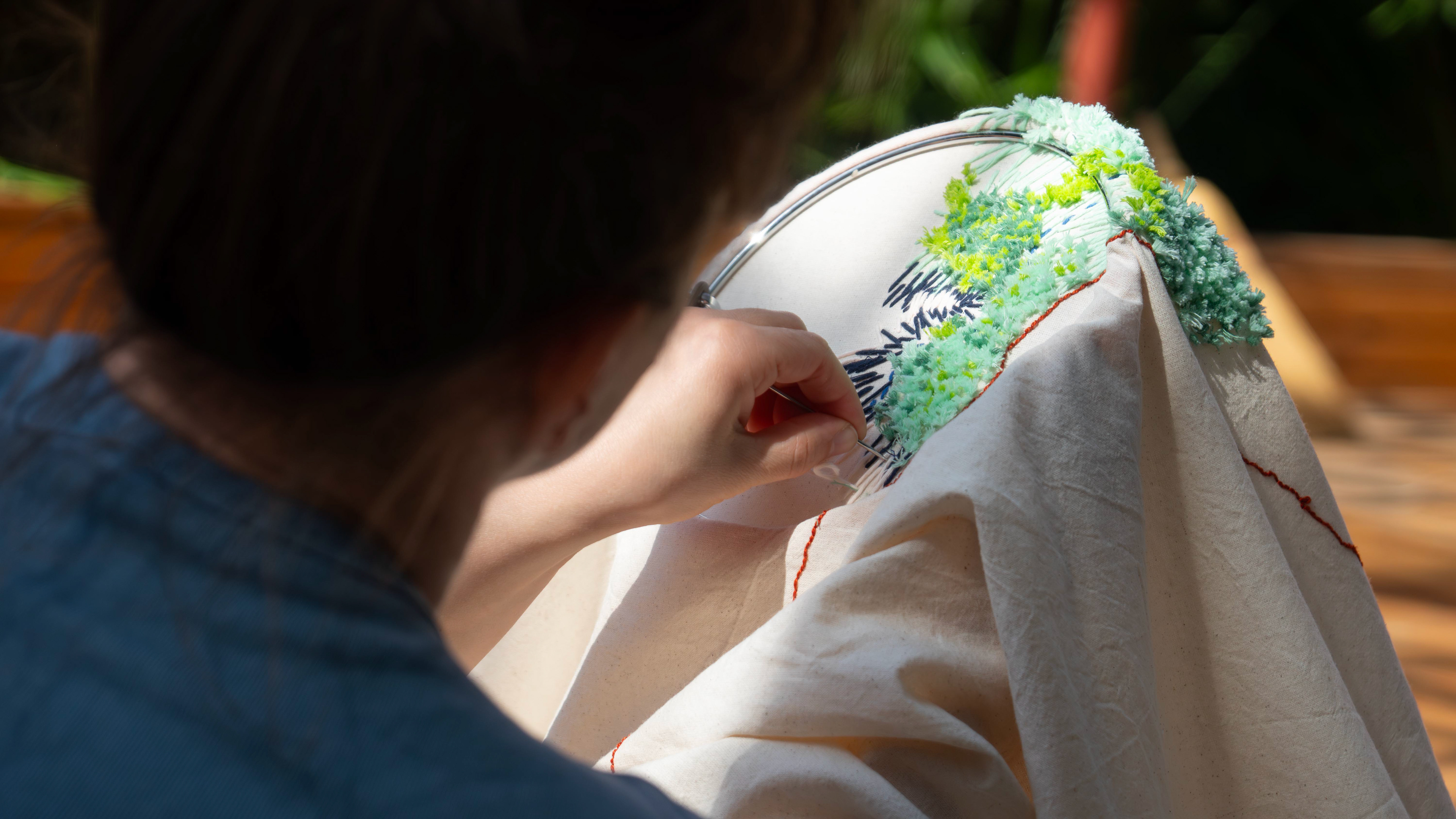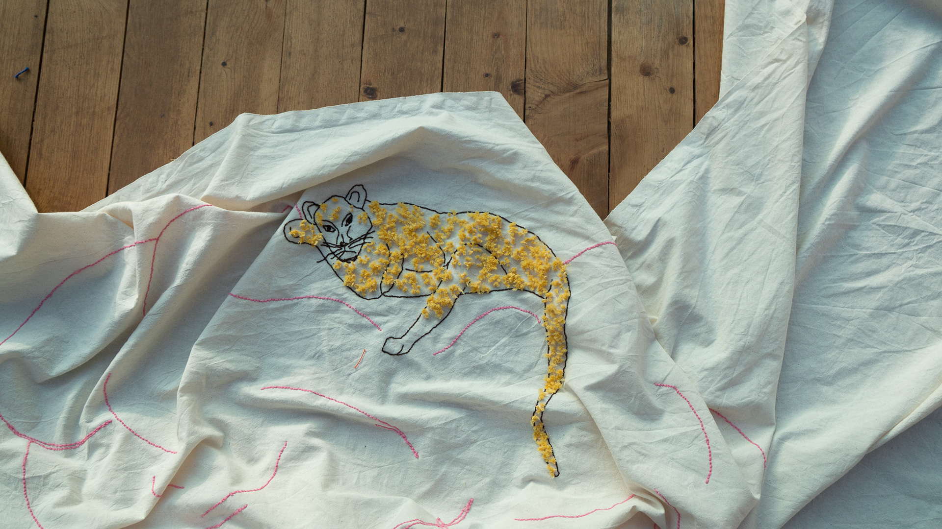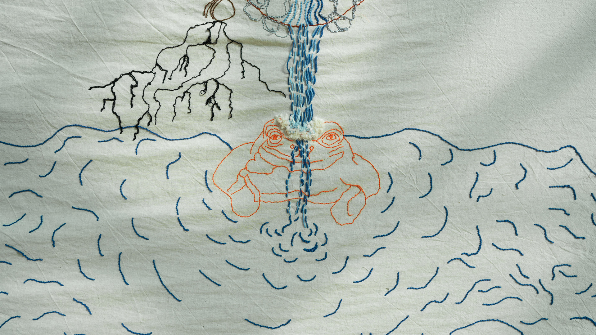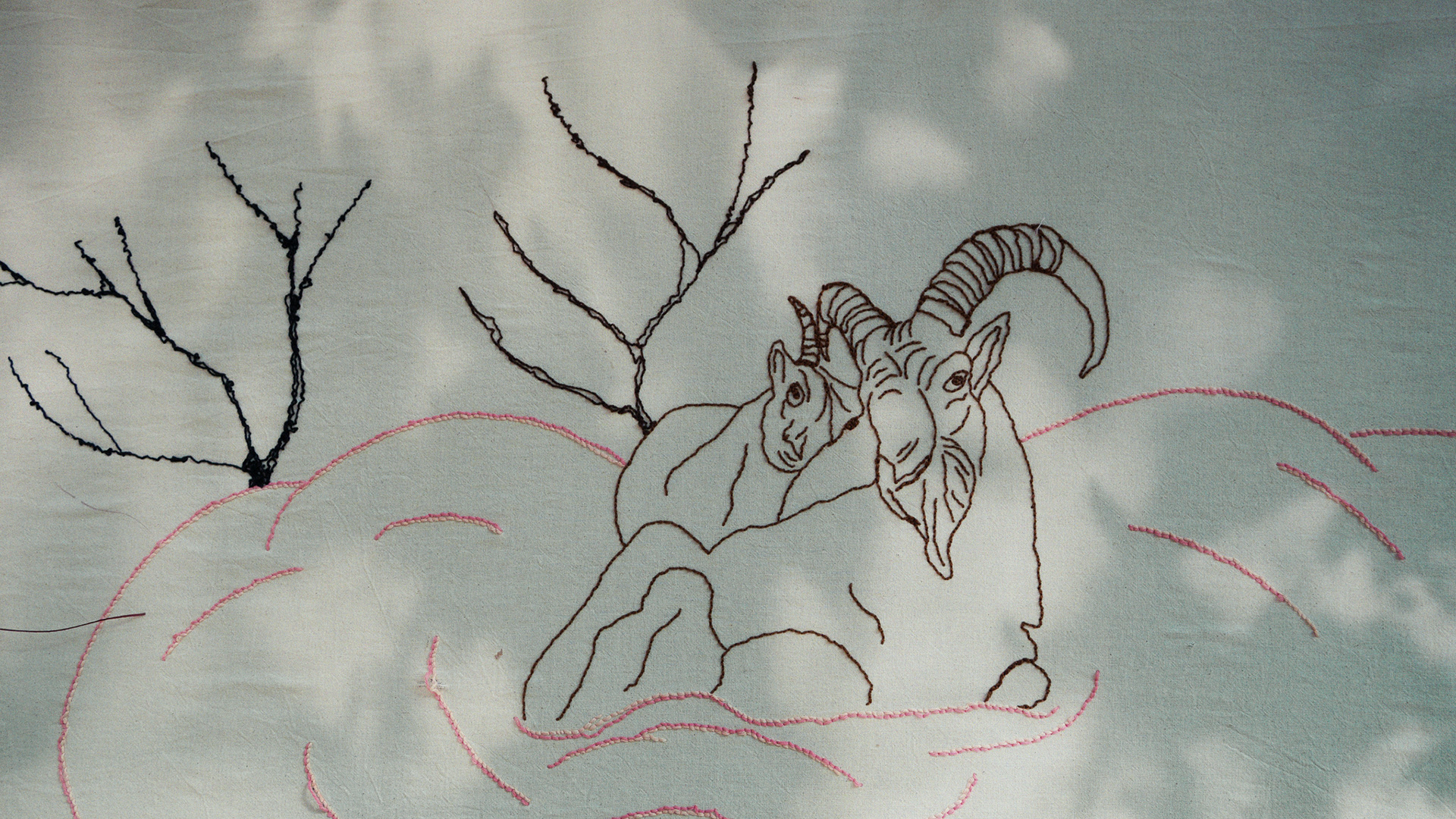 What Is Inside the Mountain? / Dağın İçinde Ne Var?", hand embroidery on unbleached cotton fabric, 600 x 200 cm, edition 1/1, 2026. "The Path is the Soul of a Mountain - Elements That Shape Life Exhibition Series III" Group Exhibition, curated by Melike Bayık, Oksitosin & Greenhouse Art Days, Antalya. Photos: Karanlık Kutu