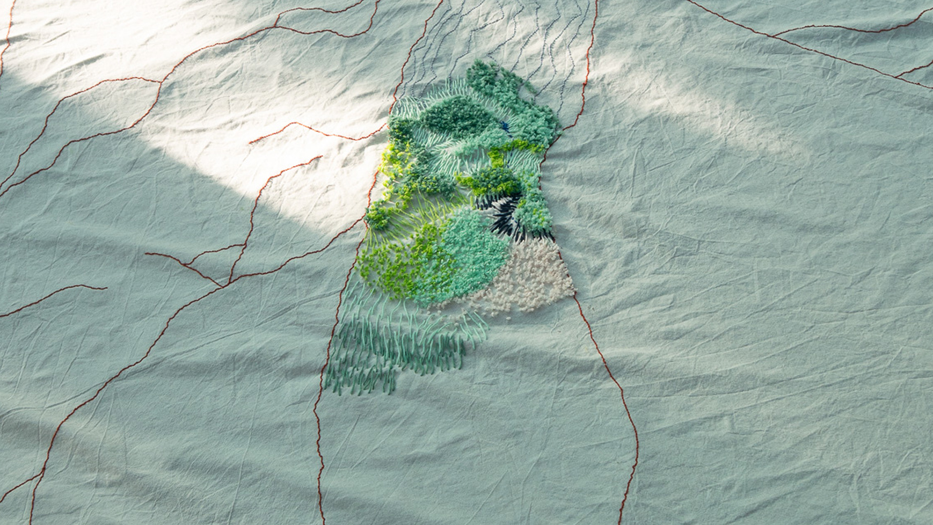 This monumental textile serves as a thread-woven map of an infinite network of relations extending from the macro to the micro. It rejects the idea of sharp boundaries or rigid thresholds separating humanity from nature. Instead, the piece visualizes existence as a continuous, transformative gradient, documenting a profound and humble integration into an overwhelming geological reality.